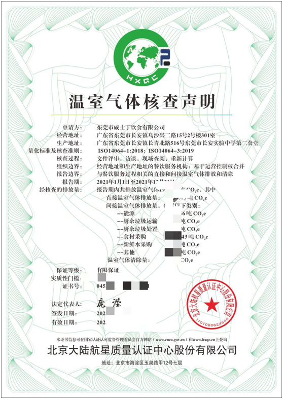 近日,北京大陸航星質(zhì)量認(rèn)證中心股份有限公司(以下簡(jiǎn)稱HXQC)為東莞市威士丁飲食有限公司(以下簡(jiǎn)稱威士丁)簽發(fā)溫室氣體核查聲明證書。這是HXQC為食品行業(yè)頒發(fā)的首張溫室氣體核查證書。