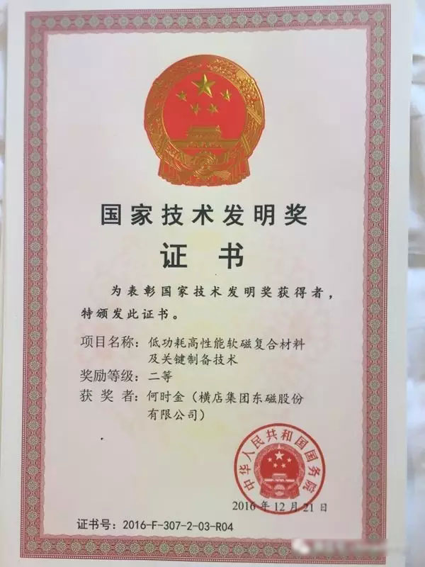 1月9號,北京大陸航星質(zhì)量認(rèn)證中心股份有限公司客戶橫店集團(tuán)東磁股份有限公司董事長何時(shí)金與浙江大學(xué)團(tuán)隊(duì)共同發(fā)明的“低功耗高性能軟磁復(fù)合材料及關(guān)鍵制備技術(shù)”,在人民大會堂舉行的一年一度國家科學(xué)技術(shù)獎(jiǎng)勵(lì)大會上獲得國家技術(shù)發(fā)明獎(jiǎng)二等獎(jiǎng),受到表彰。